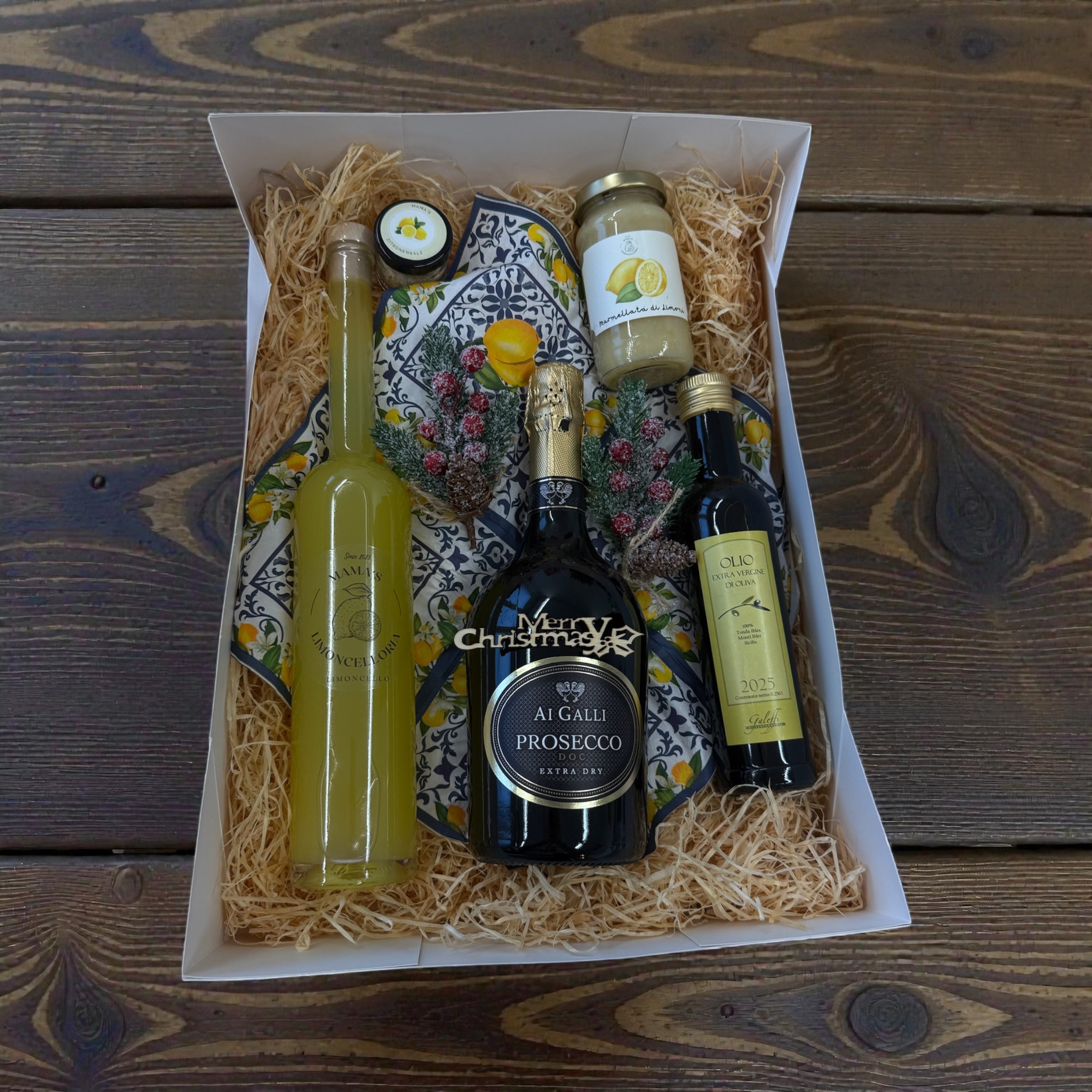 Unser Mediterranes Weihnachtskörbchen ist die elegante Geschenkidee für alle, die Italien lieben. Mit sorgfältig ausgewählten Spezialitäten und handgemachtem Limoncello bringt dieses Körbchen mediterrane Wärme direkt in die Winterzeit.